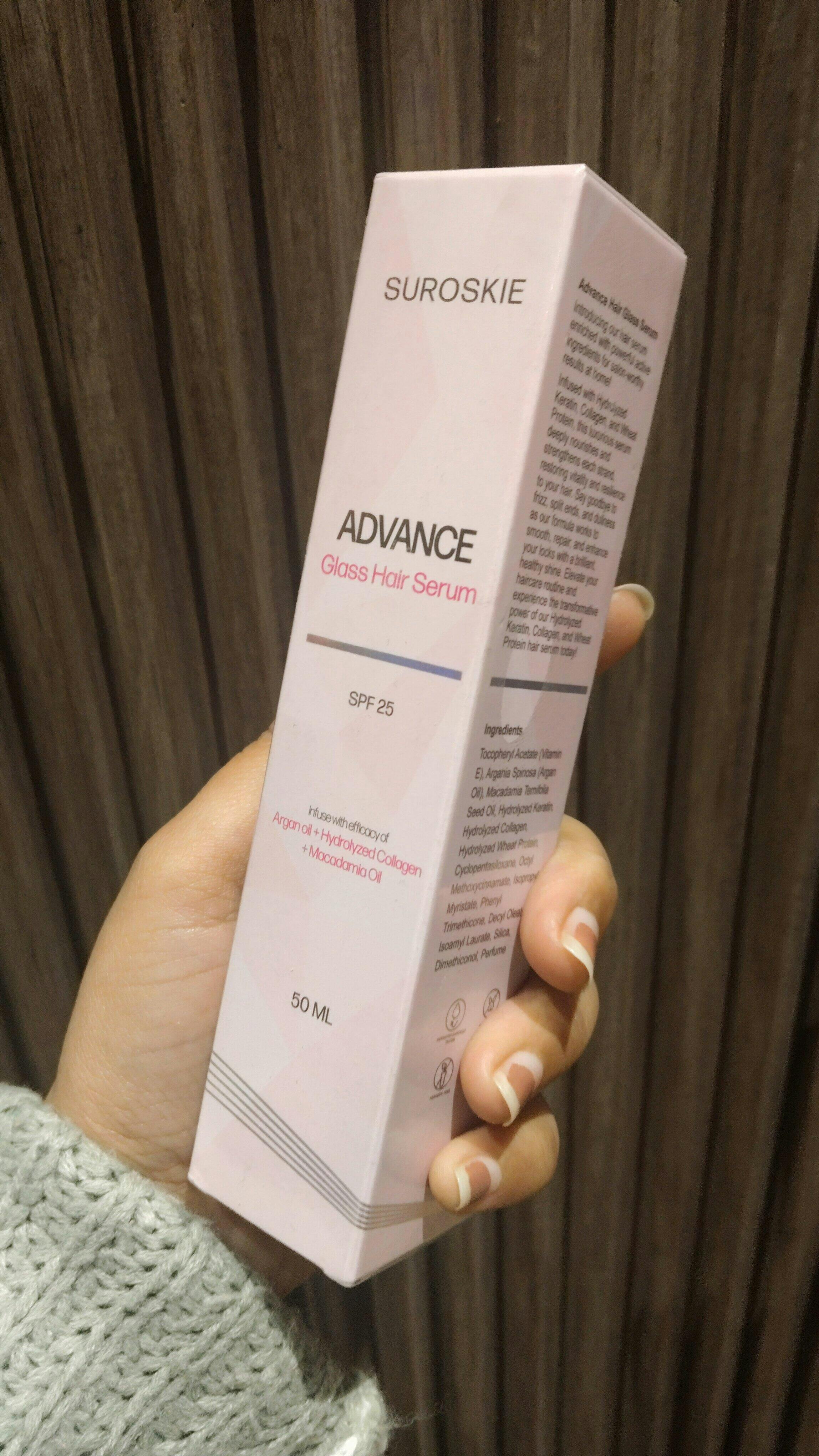 Suroskie Advance Glass Hair Serum is a next-generation shine and repair elixir formulated with Vitamin E, Argan Oil, Macadamia Oil, and Hydrolyzed Proteins.