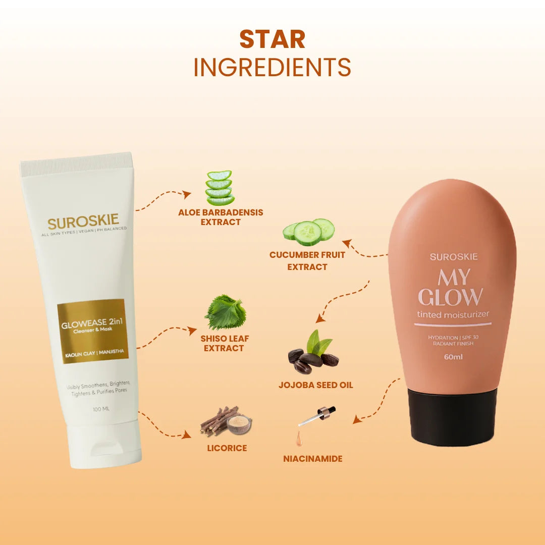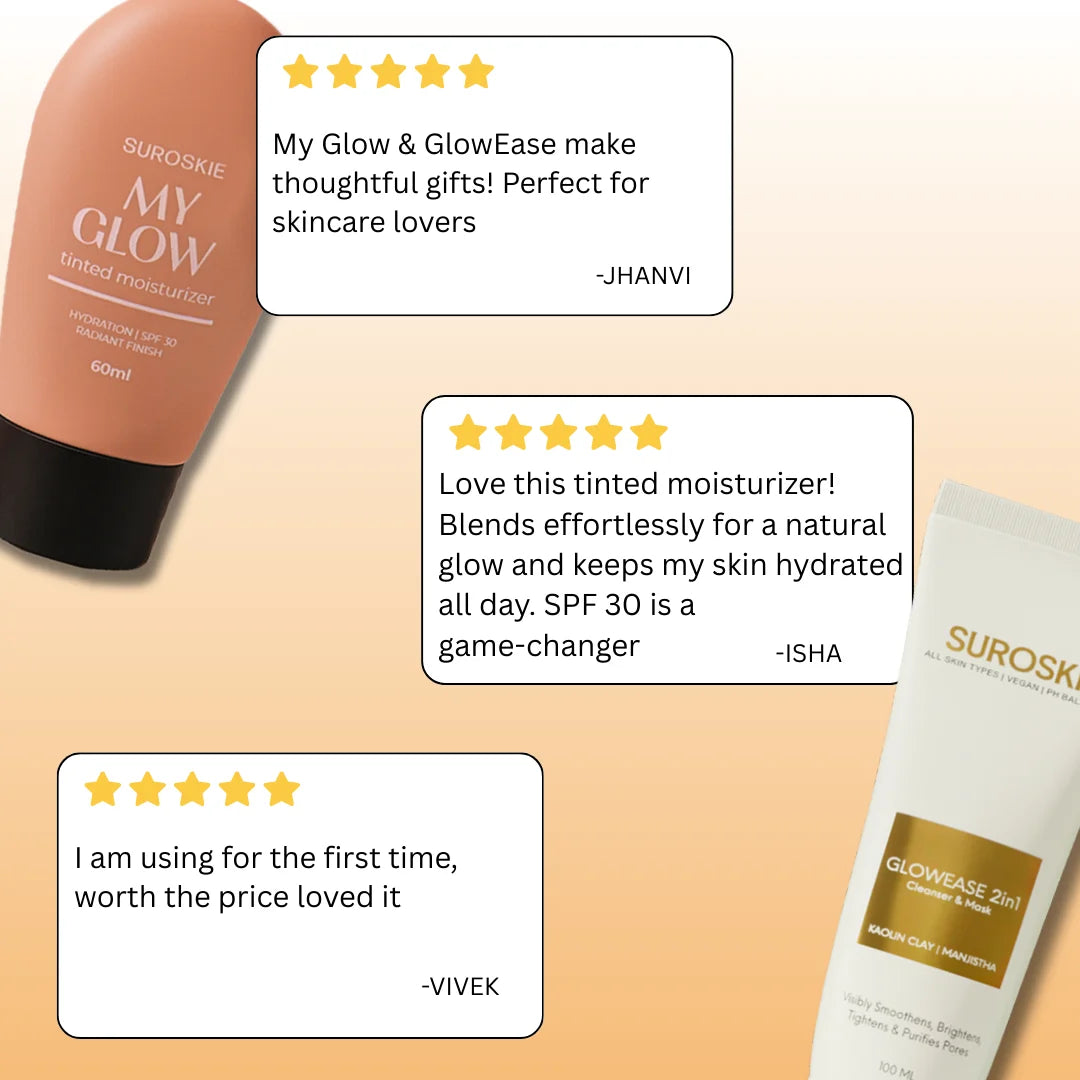 For smooth, glowing, and effortlessly youthful-looking skin, My Glow + GlowEase Combo is the ideal daily combination. Start with GlowEase 2-in-1 Cleanser & Mask to maintain hydration while gently cleansing, purifying pores, and refining skin texture. Use My Glow Tinted Moisturizer afterward to provide a natural, radiant finish with SPF protection, even out skin tone, and increase moisture. This combination makes your routine easier while boosting your natural glow; it's perfect for everyday wear, makeup-free looks, or fast skin preparation. When combined, they leave your skin feeling balanced, clean, and radiant throughout the day.